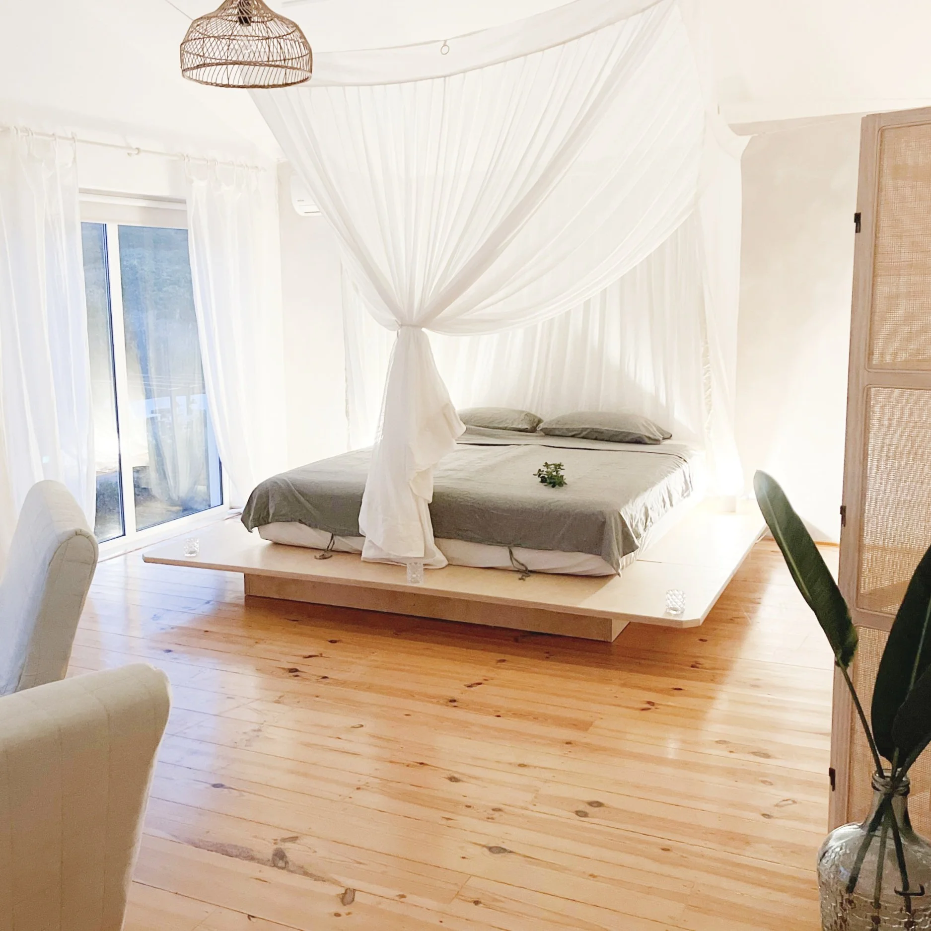 Sisustus on huolella suunniteltu vastaamaan surffisiskojen retriitin tarpeita ja luomaan rauhallista tunnelmaa.